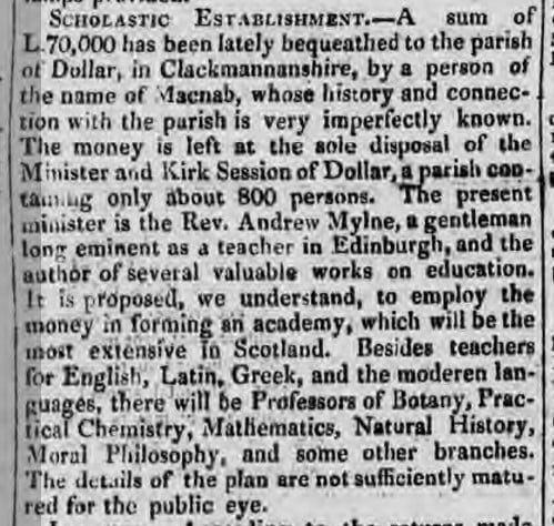 John McNabb died in 1802 and in his will he specified that the interest on half his estate was to provide “a Charity or School for the parish of Dollar and shire of Clackmannan wheir I was born.”